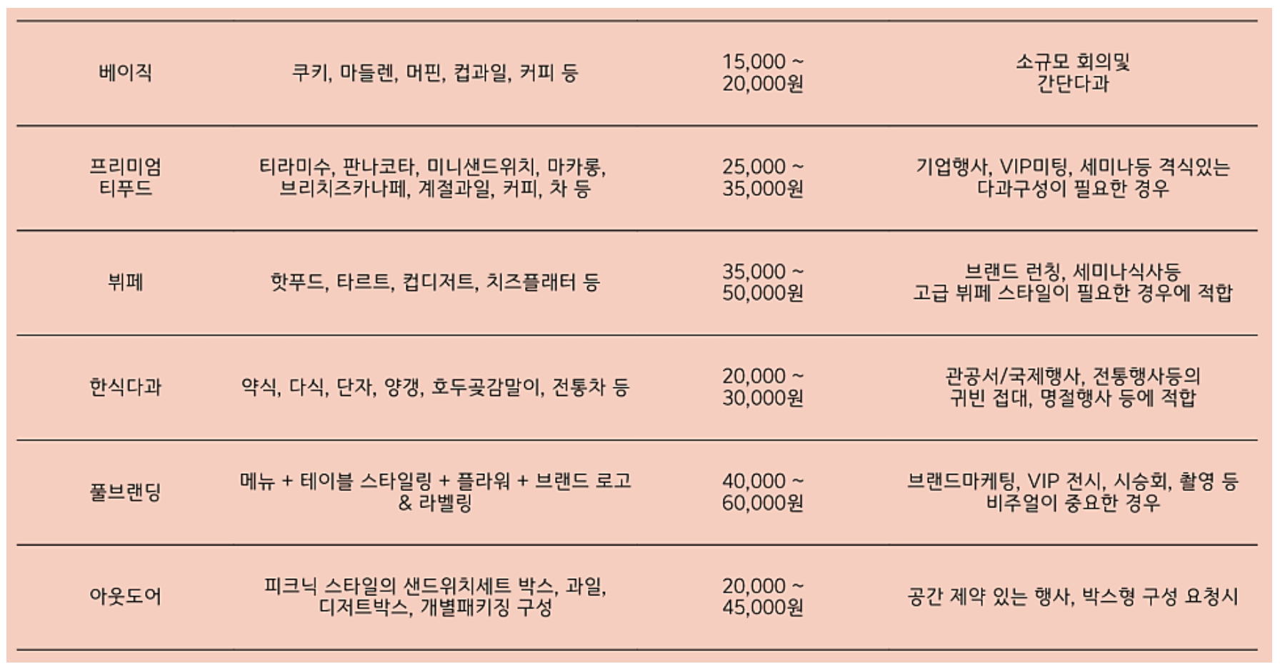 행사의 크기와 내용에 따라 준비하는 음식및 다과의 양, 서비스의 범위는 다양하다.